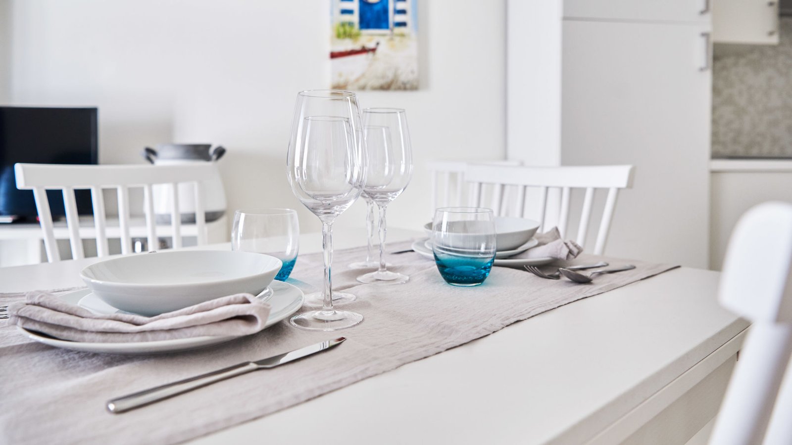 The kitchen is equipped with dishes, tableware and major appliances: oven, fridge/freezer and coffee maker.