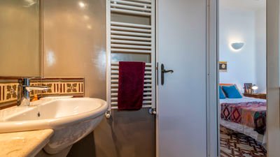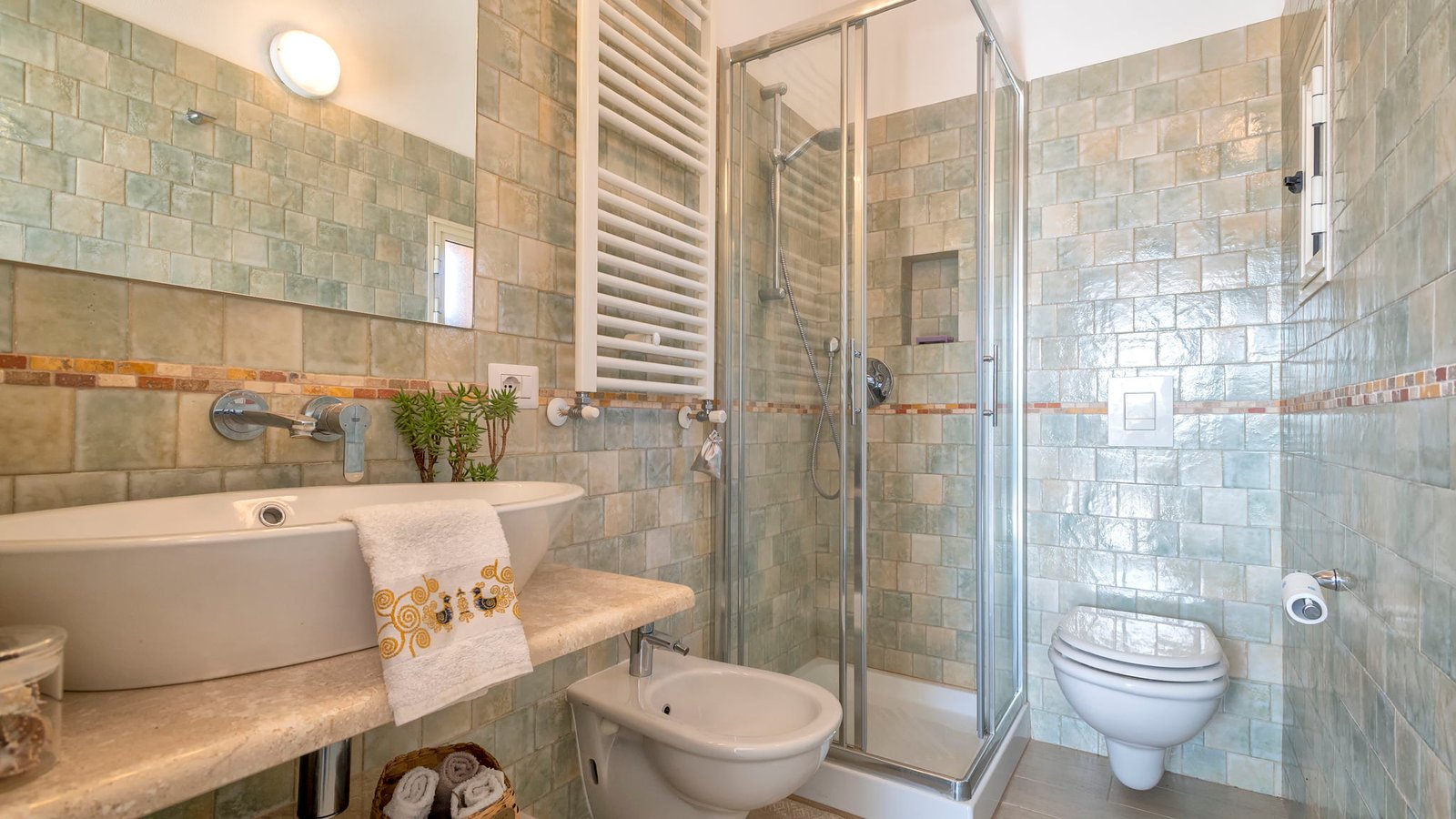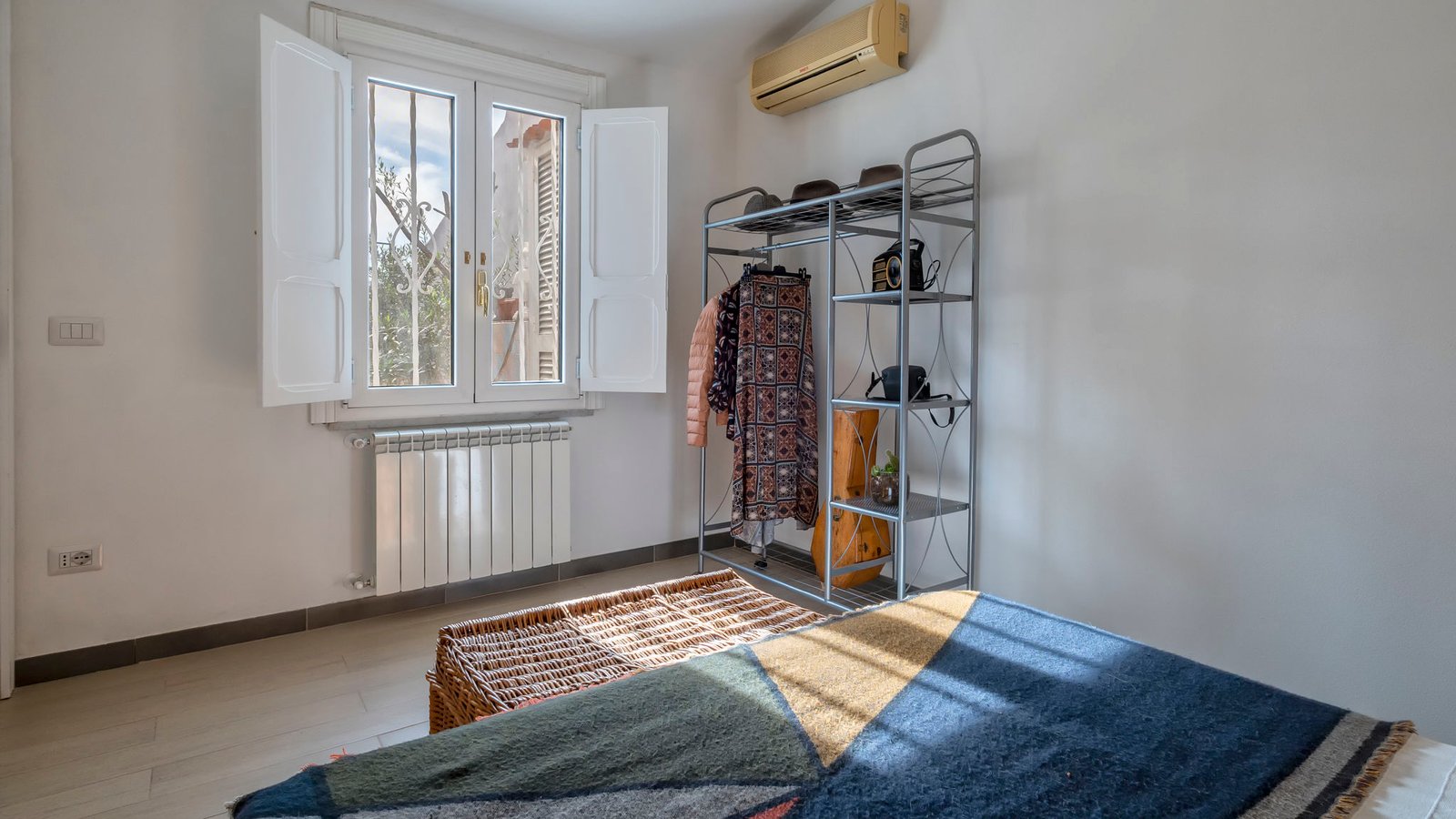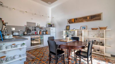 The living area is divided into two parts, the first includes the fully equipped kitchen area with table and chairs, and the second offer a large and bright living room and a typical late 19th-century French window that directly connects the large and suggestive terrace enriched by plants and flowers that determine the taste and elegance for a super Urban Chic apartment proposed by Sardinia Re.