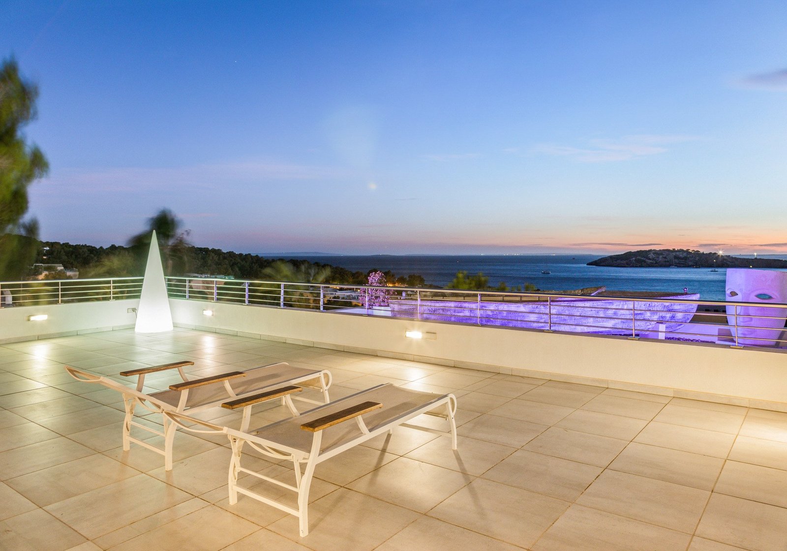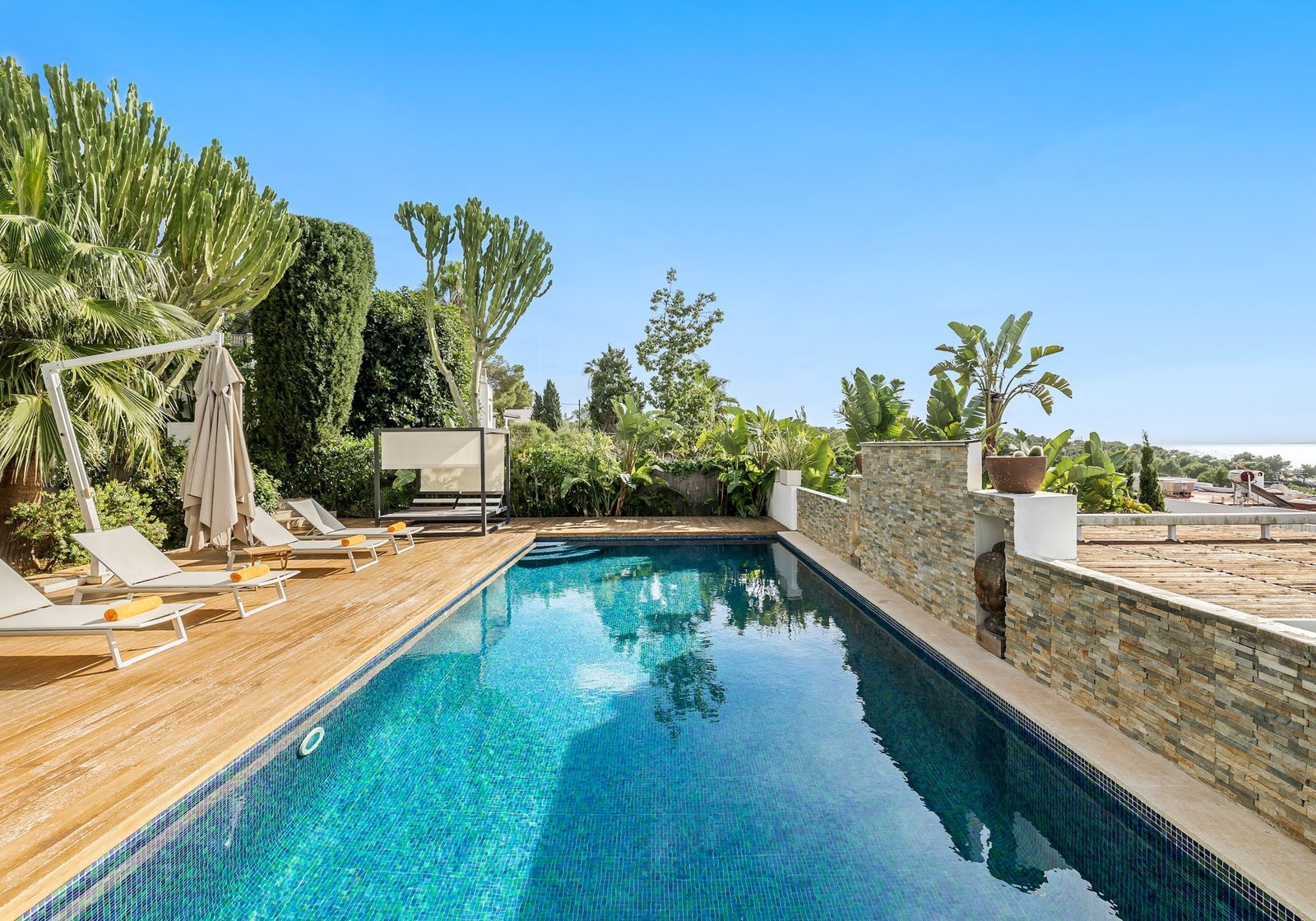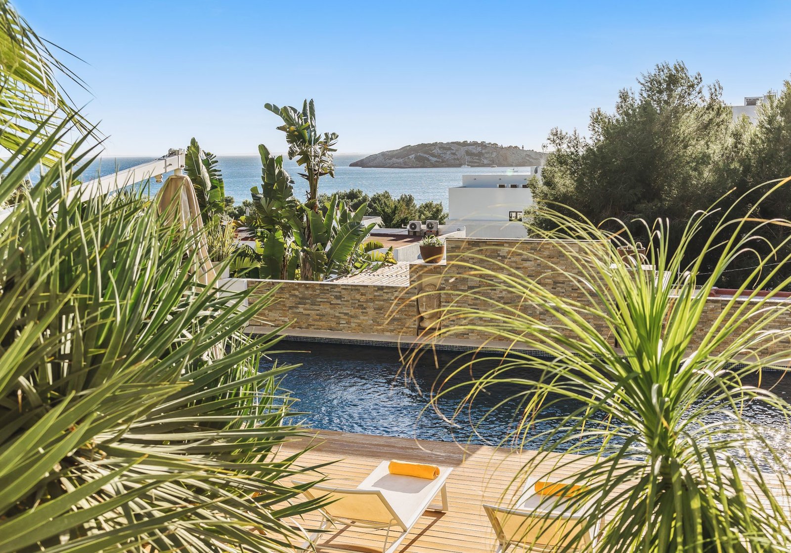 A large terrace including a swimming pool offers stunning views of the sea and plenty of places to relax and enjoy a glass of champagne. Whether you choose to relax with a book by the pool, enjoy a glass of wine while marveling at the sea view or enjoy the nightlife in Ibiza town, this property is the perfect getaway.