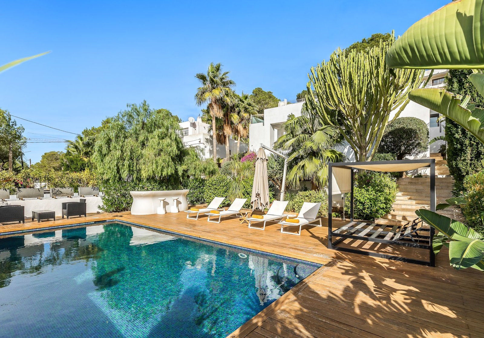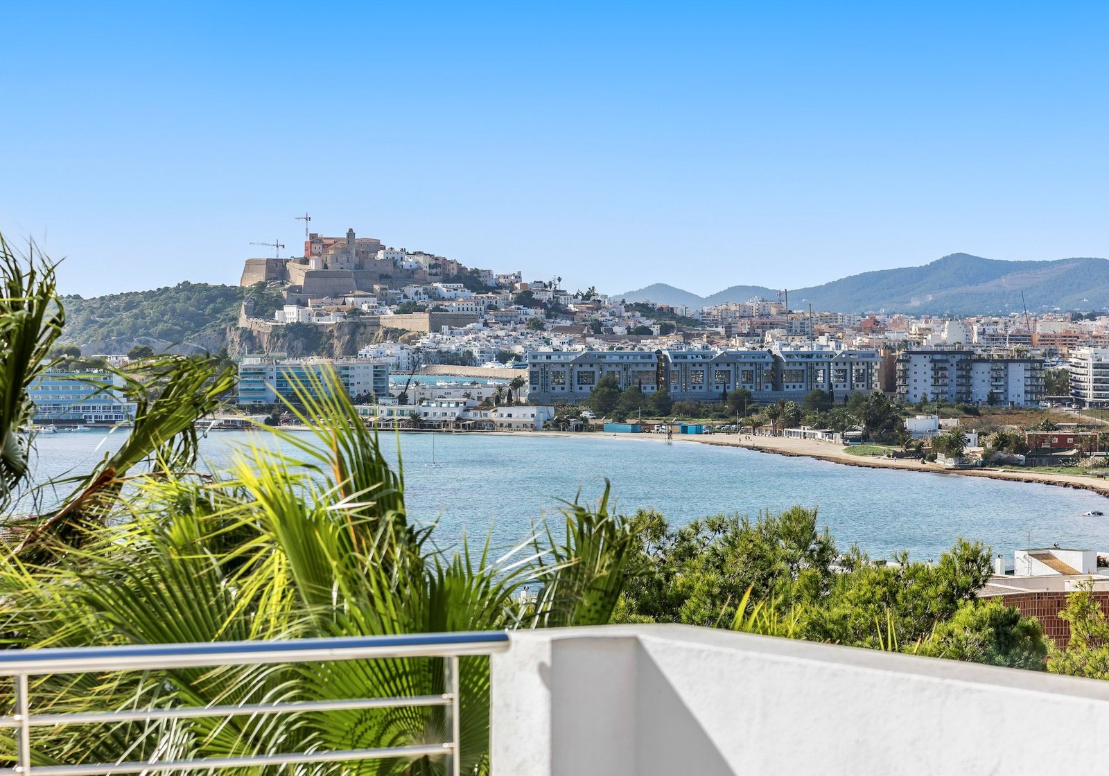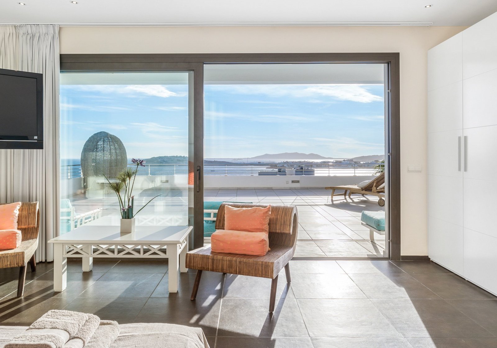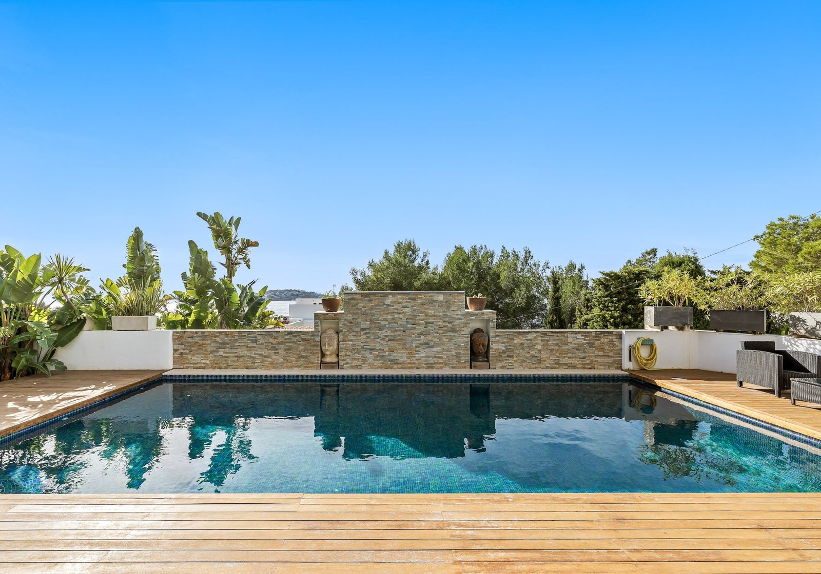 A large terrace including a swimming pool offers stunning views of the sea and plenty of places to relax and enjoy a glass of champagne. Whether you choose to relax with a book by the pool, enjoy a glass of wine while marveling at the sea view or enjoy the nightlife in Ibiza town, this property is the perfect getaway.