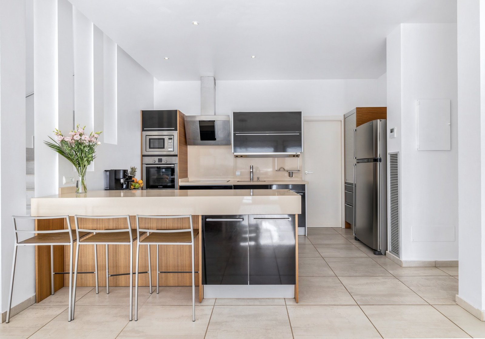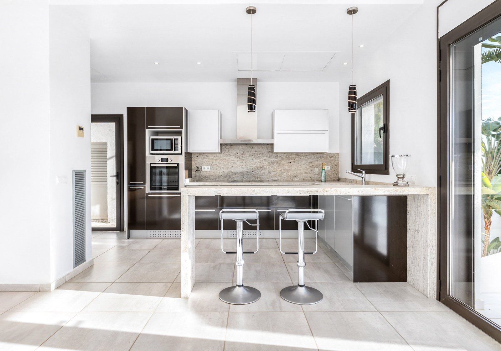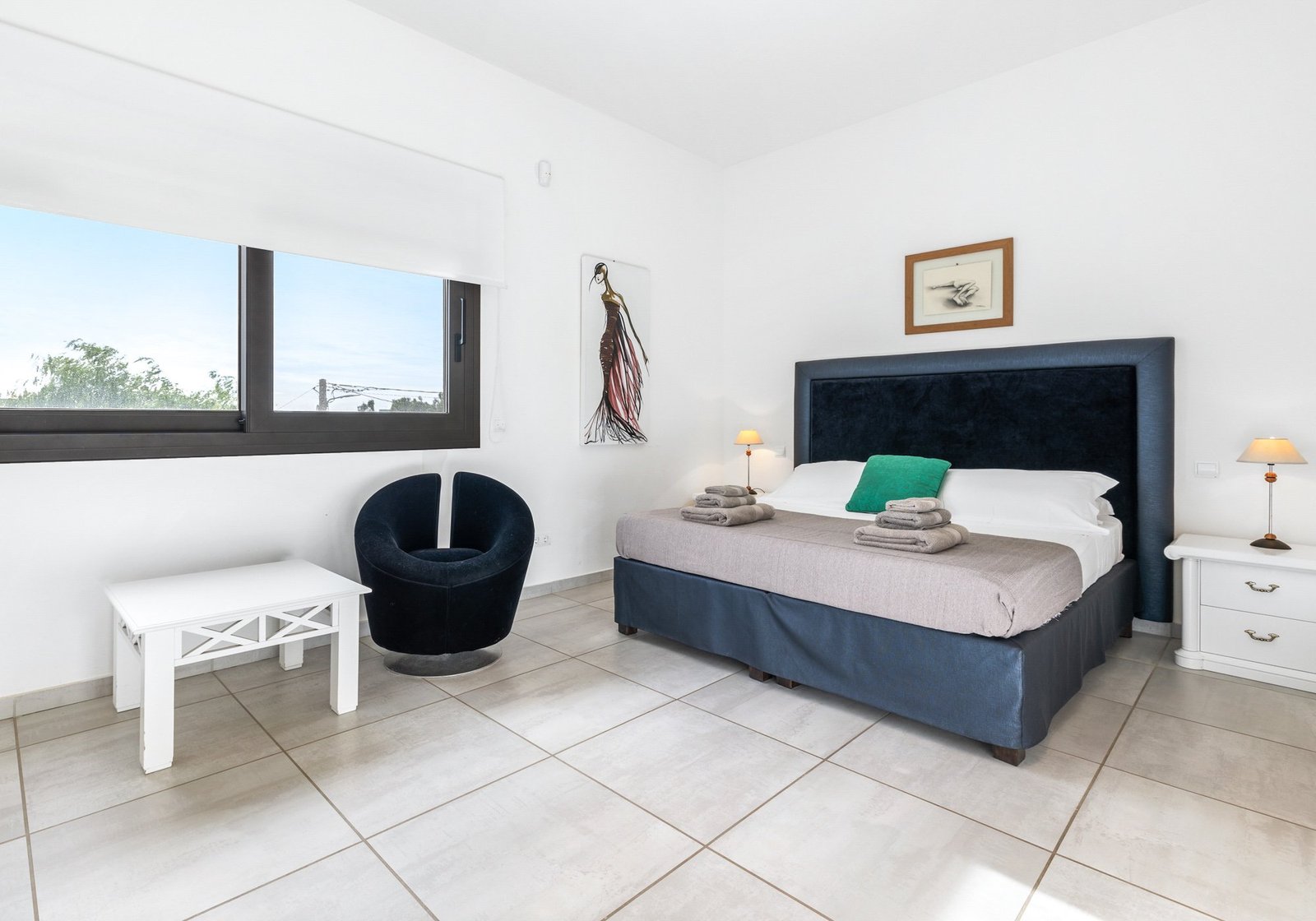 This luxury holiday villa offers a fairly open living plan and the rooms are bright with natural light due to large windows and sliding glass doors throughout. The villa is furnished in an elegant, relaxed style, the art and furnishings are in keeping with its sophisticated yet inviting aura with splashes of color enlivening the white walls and floors.