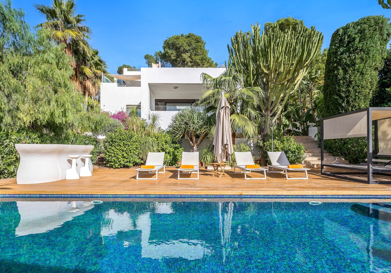 The villa is surrounded by beautiful gardens which showcase plants common to Ibiza including Mediterranean pines, palms, oleander and bougainvillea. The outdoor dining and lounging area provides an ideal spot for al fresco meals and aperitifs.