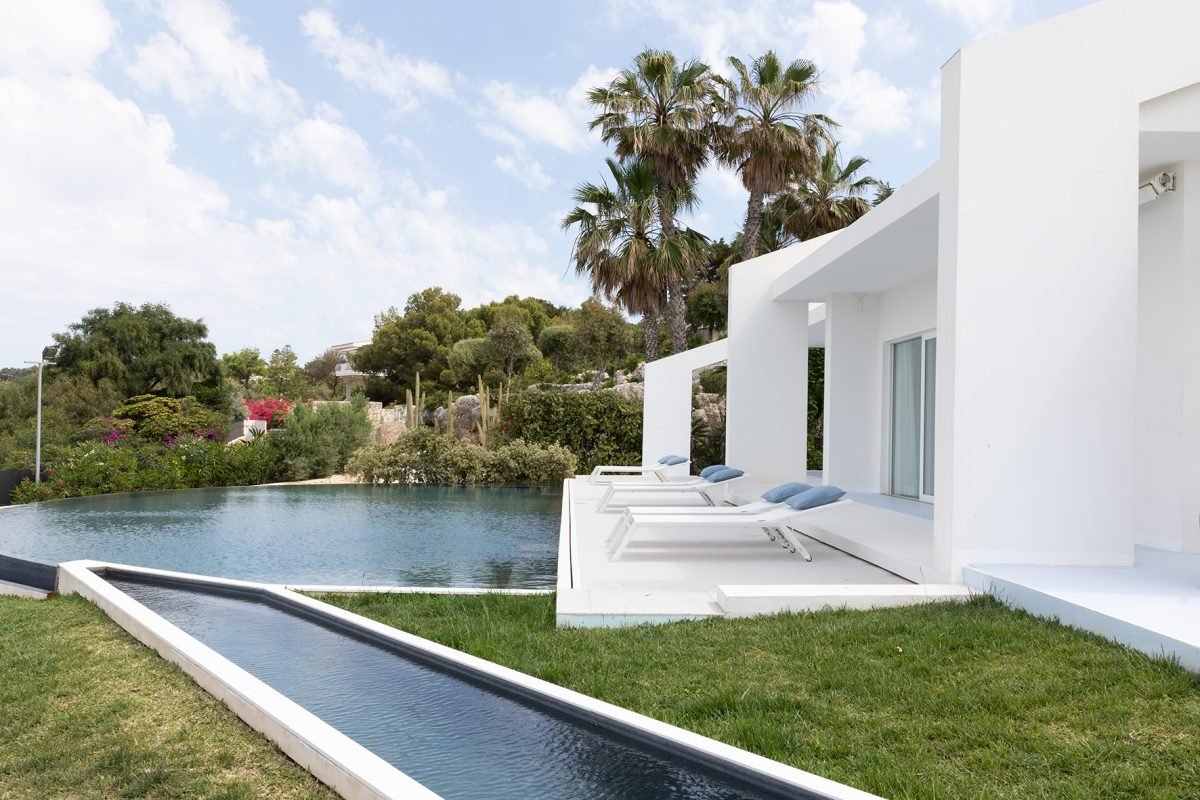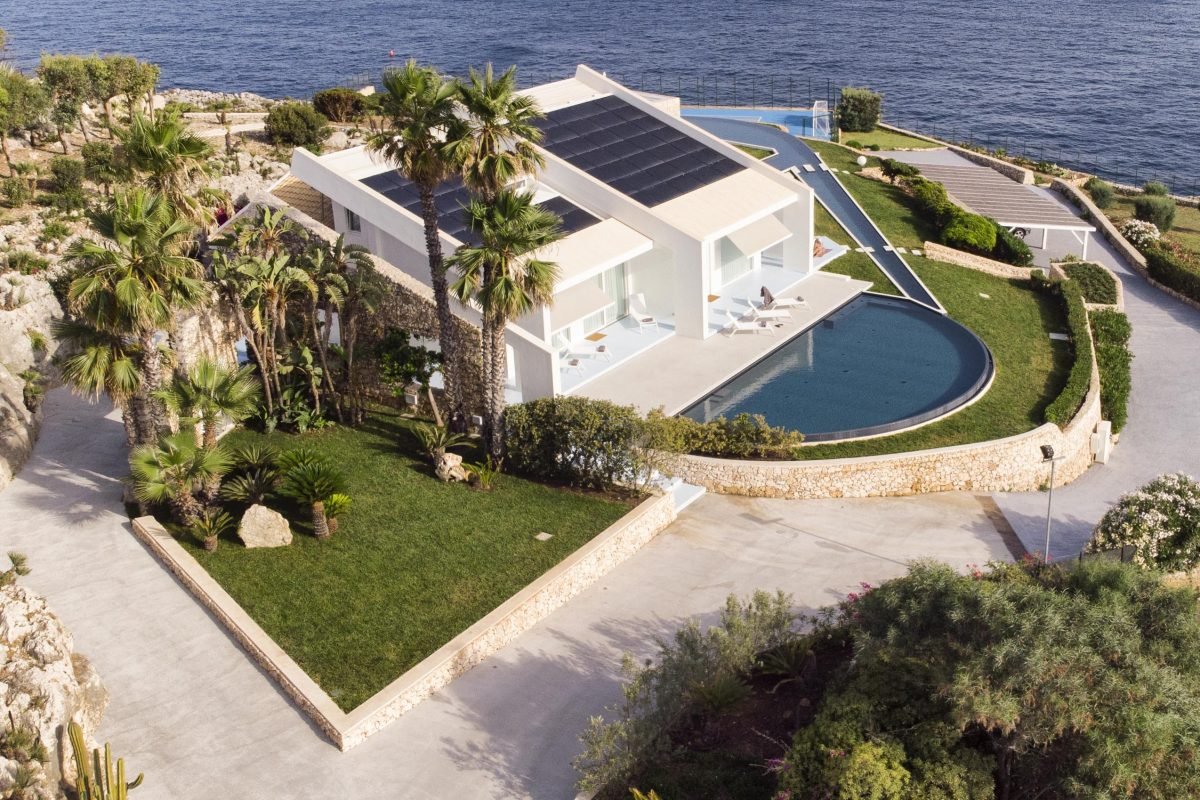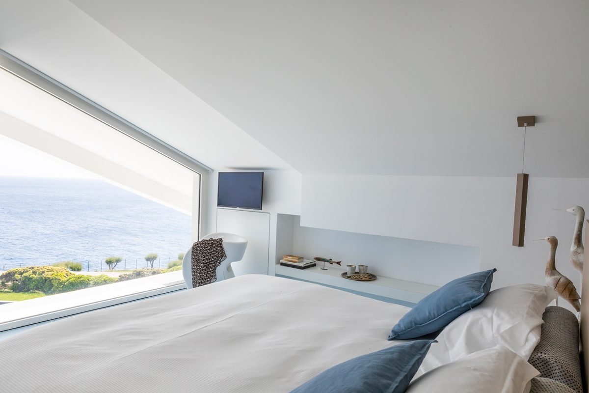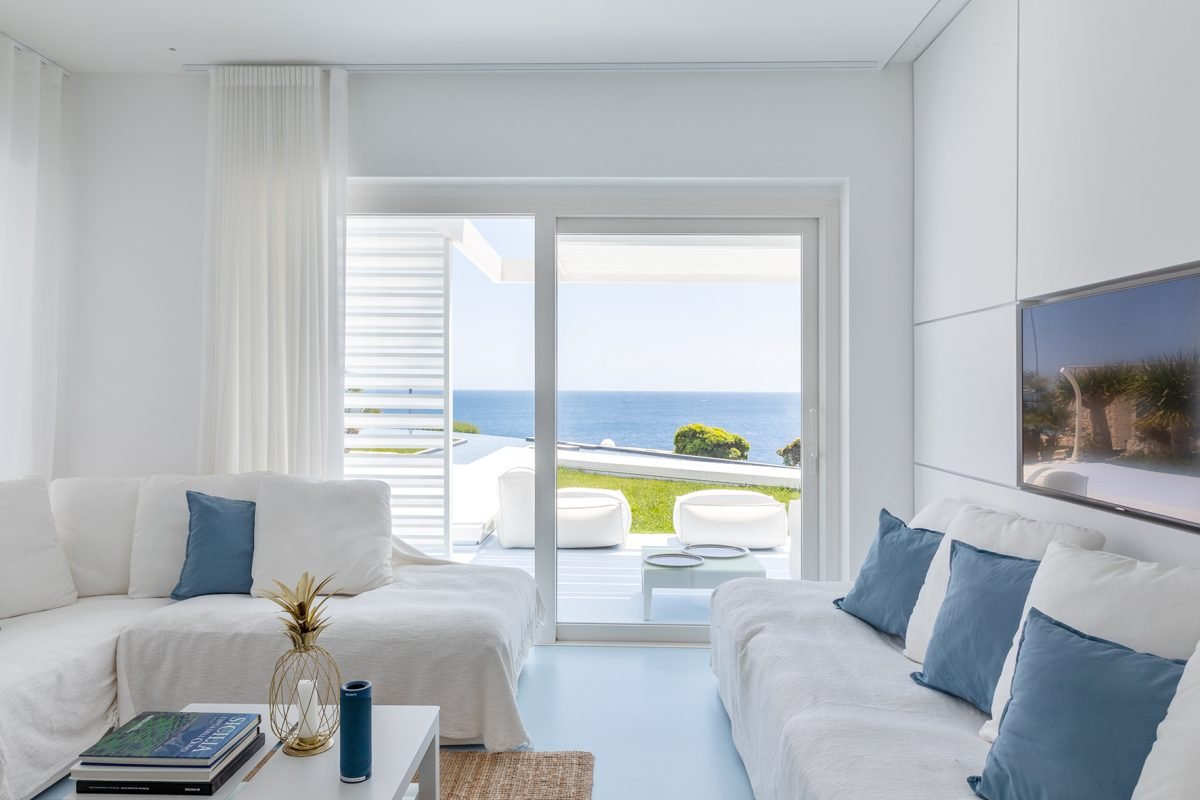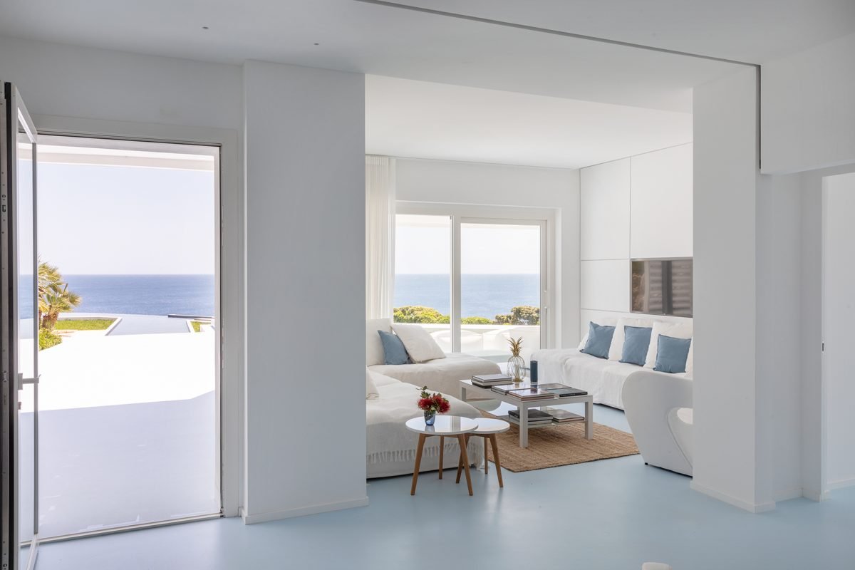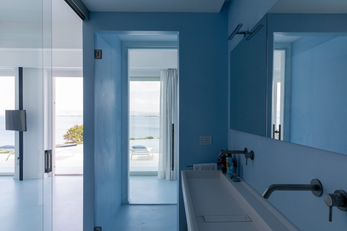 The villa’s interiors are as resplendent as its vibrant exterior surroundings. Tones of azure and sky-blue carry through from the outside to the inside, harmoniously fused together in the colour scheme and decor and further amplified through the large glass windows. The view of the sea can be admired as comfortably from the sofa in the living room or from the bedroom, as from the superb terraces that surround the villa.