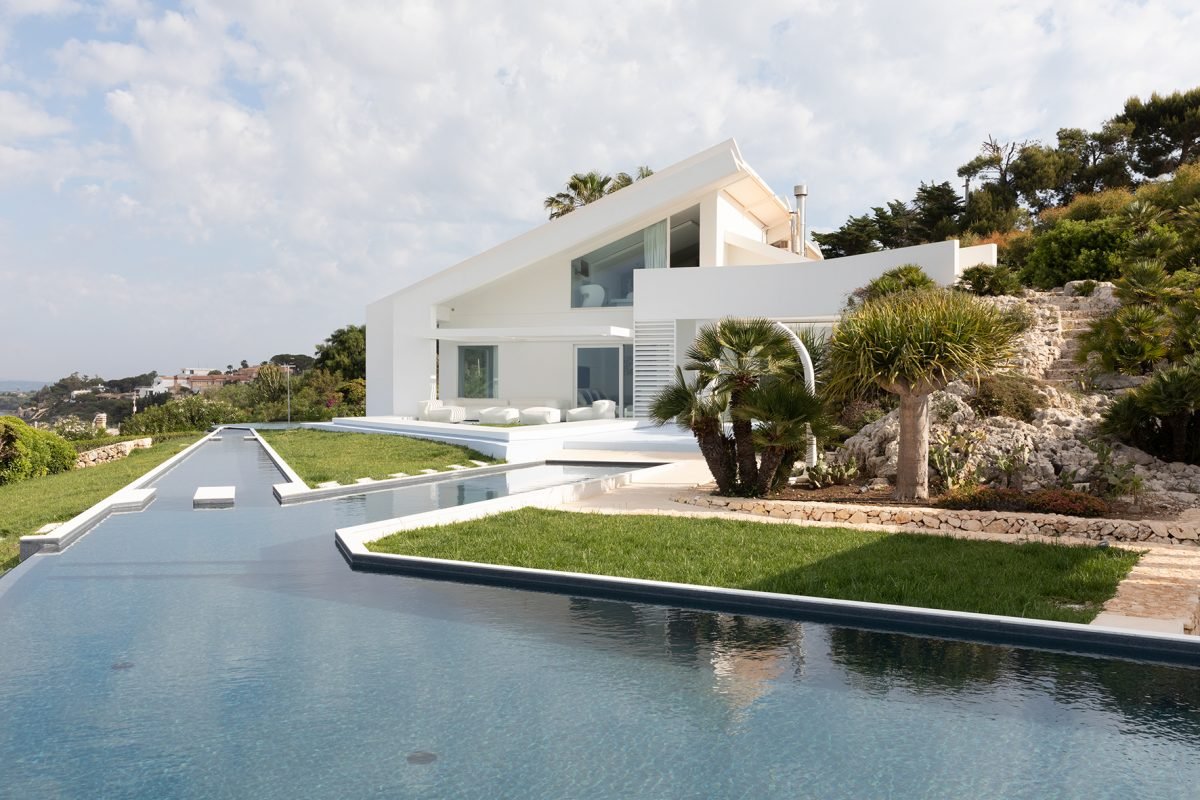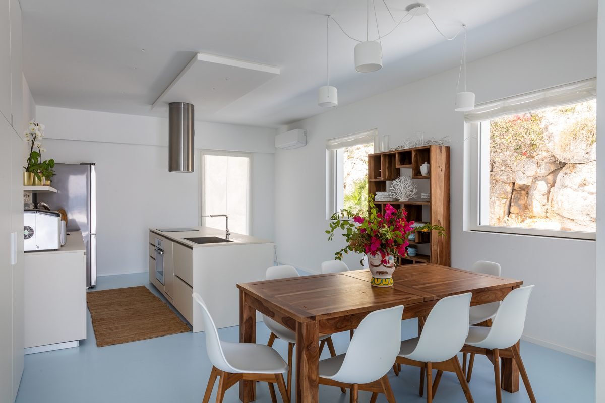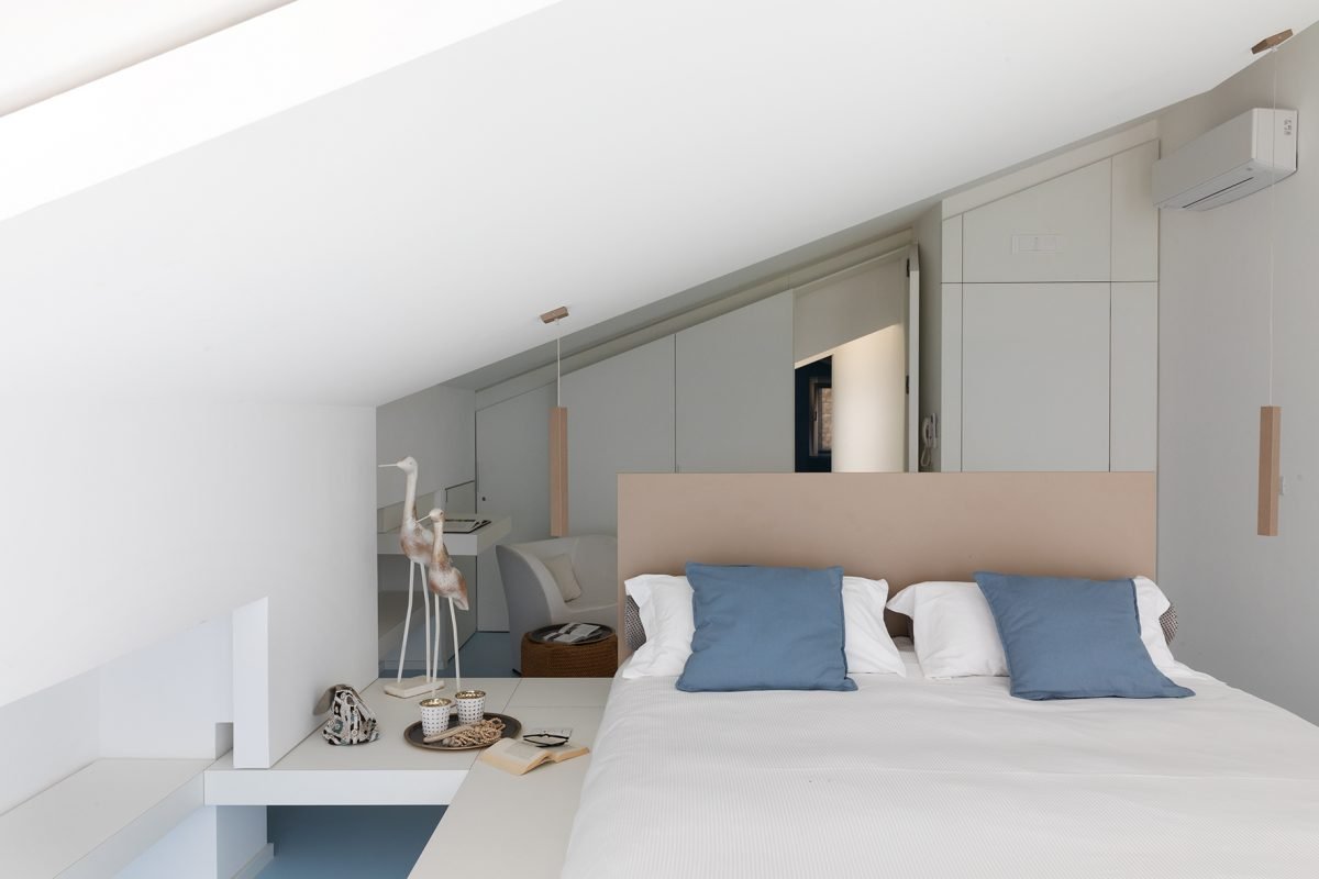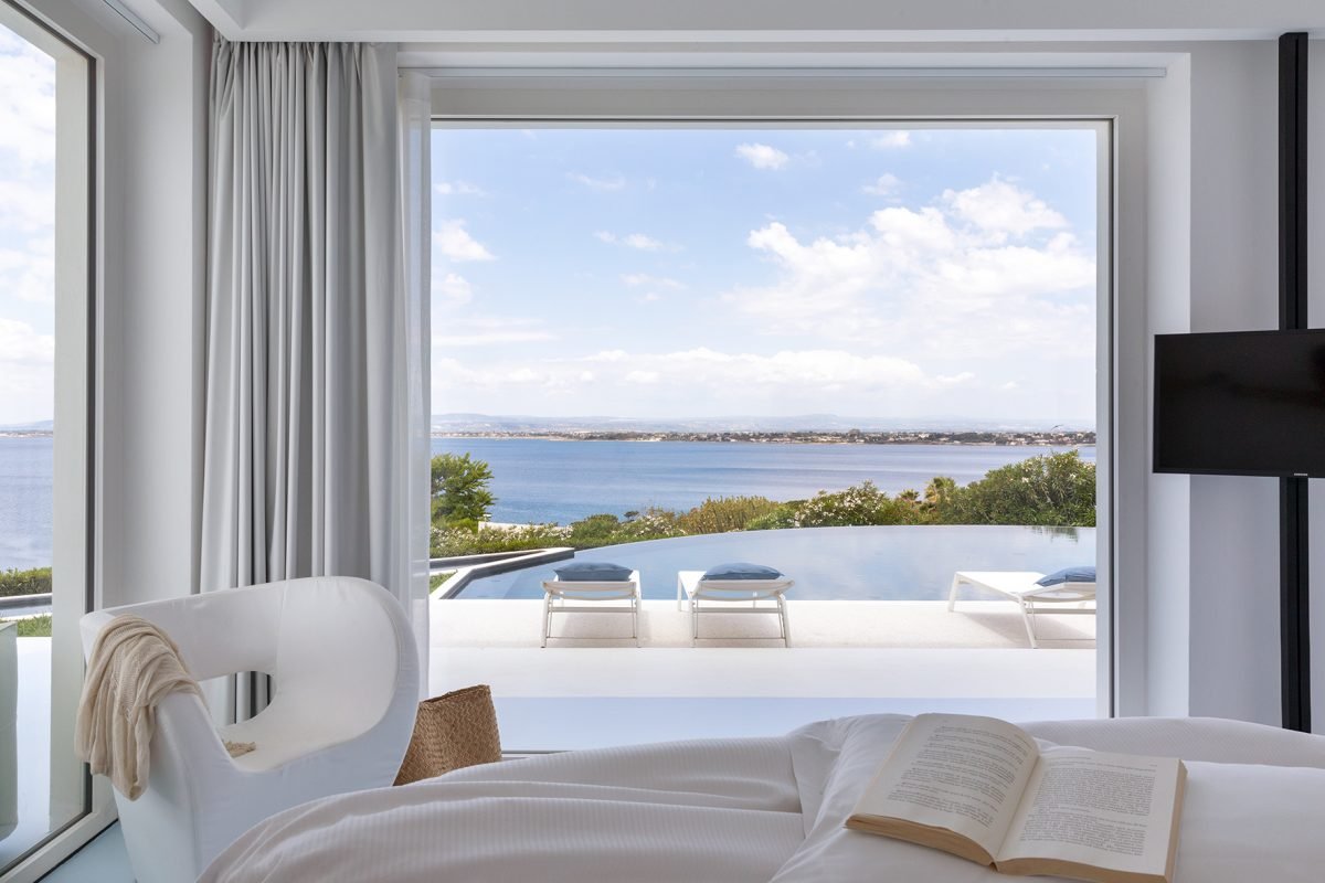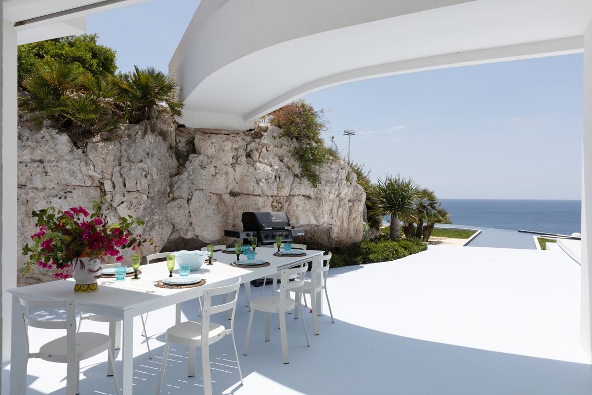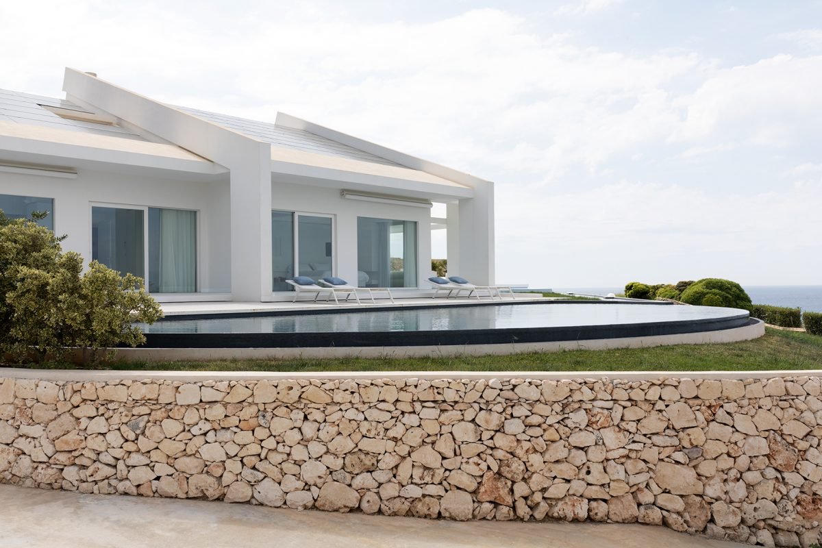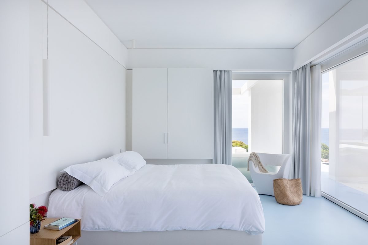 The villa’s interiors are as resplendent as its vibrant exterior surroundings. Tones of azure and sky-blue carry through from the outside to the inside, harmoniously fused together in the colour scheme and decor and further amplified through the large glass windows. The view of the sea can be admired as comfortably from the sofa in the living room or from the bedroom, as from the superb terraces that surround the villa.