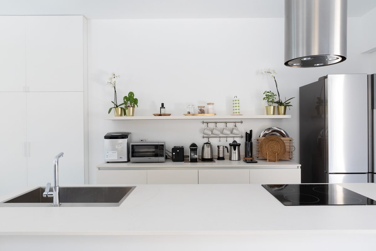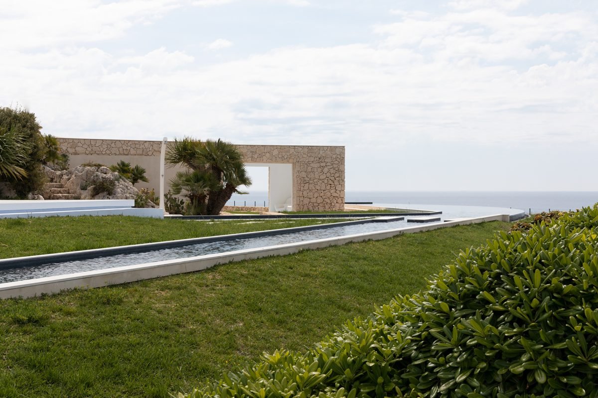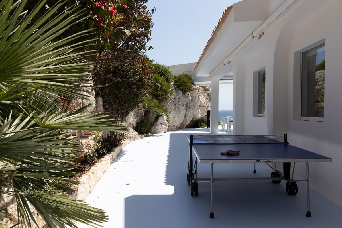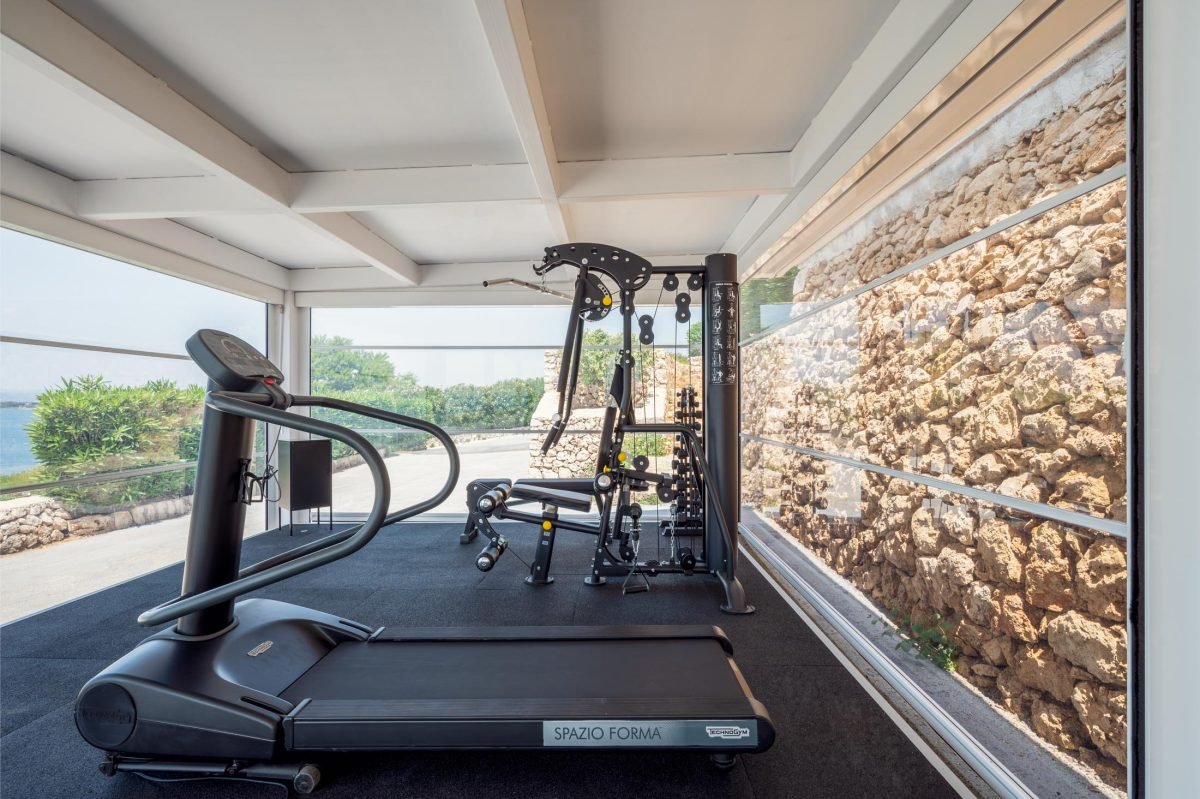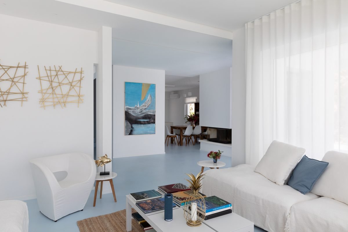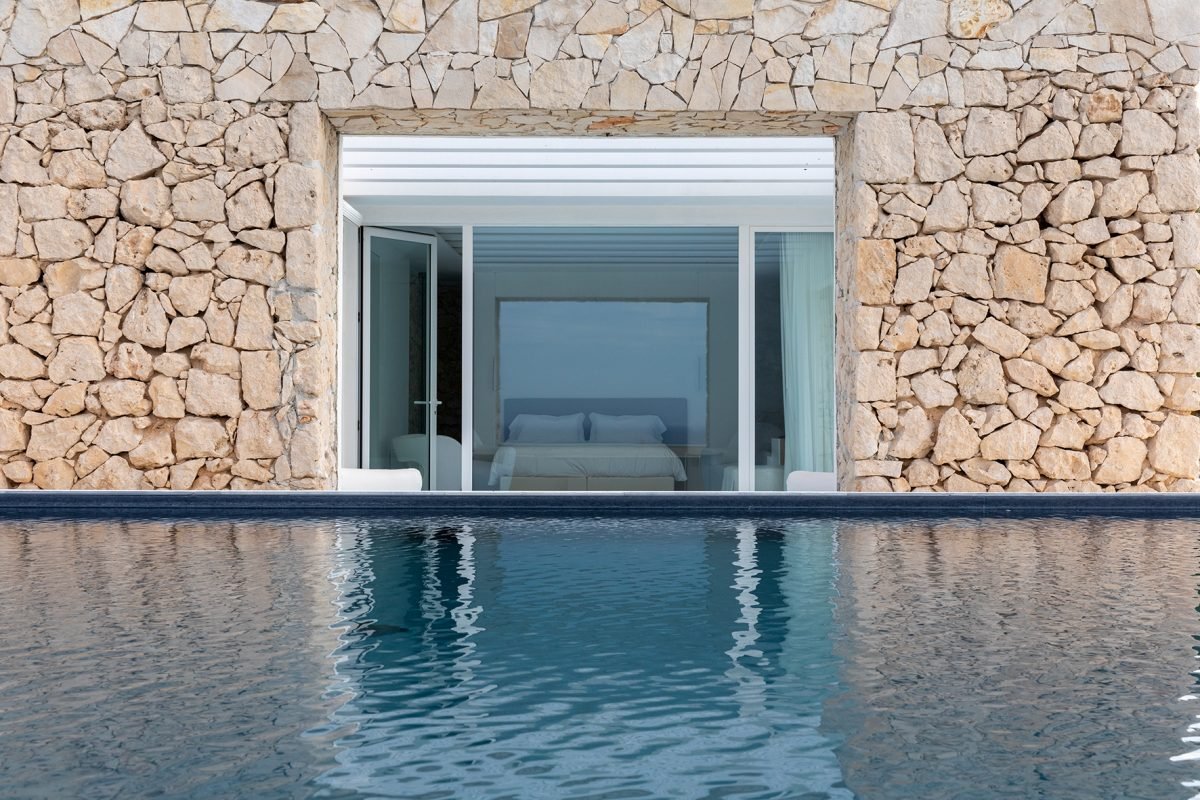 The villa’s interiors are as resplendent as its vibrant exterior surroundings. Tones of azure and sky-blue carry through from the outside to the inside, harmoniously fused together in the colour scheme and decor and further amplified through the large glass windows. The view of the sea can be admired as comfortably from the sofa in the living room or from the bedroom, as from the superb terraces that surround the villa.