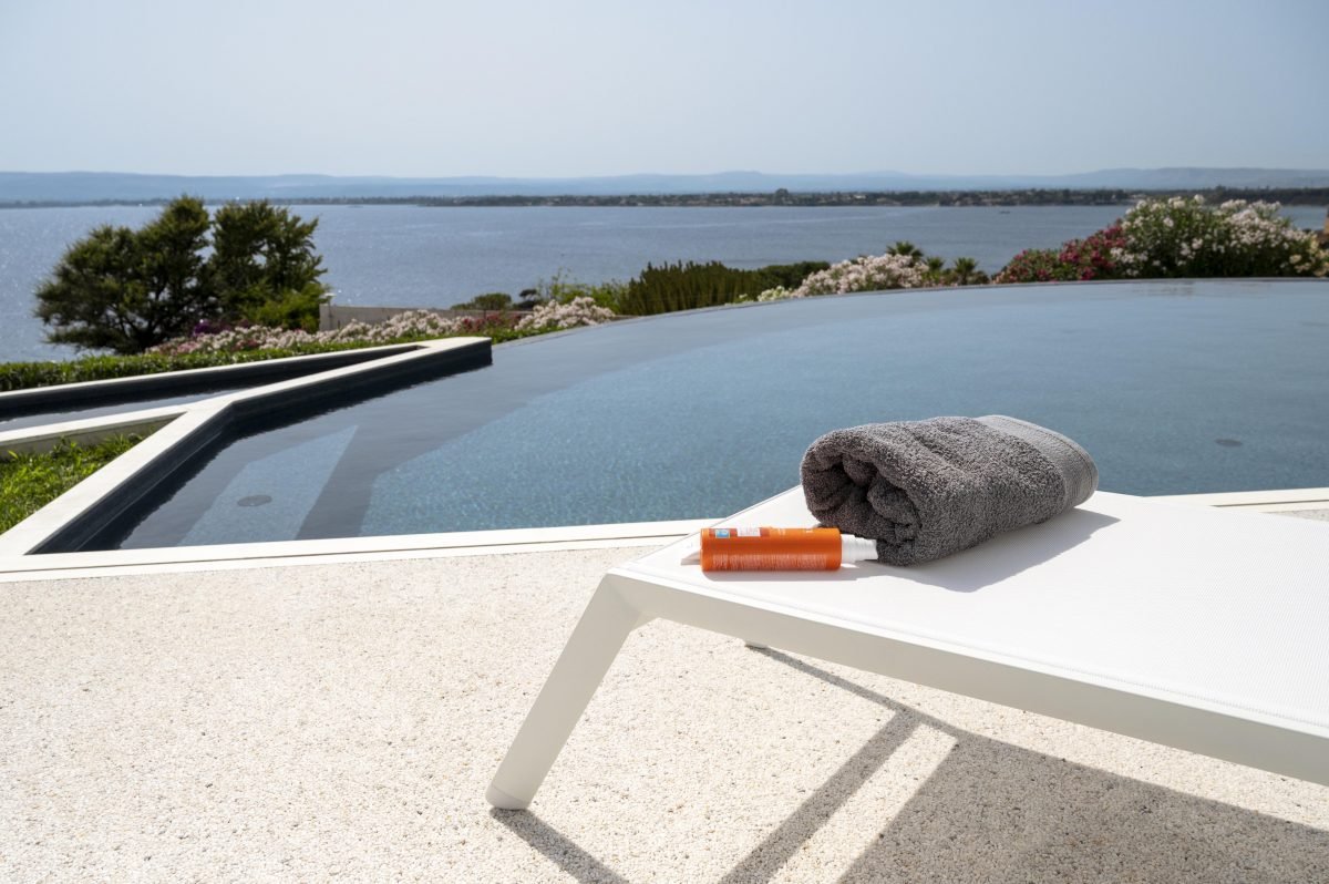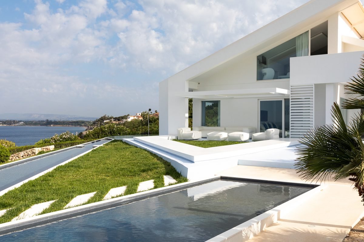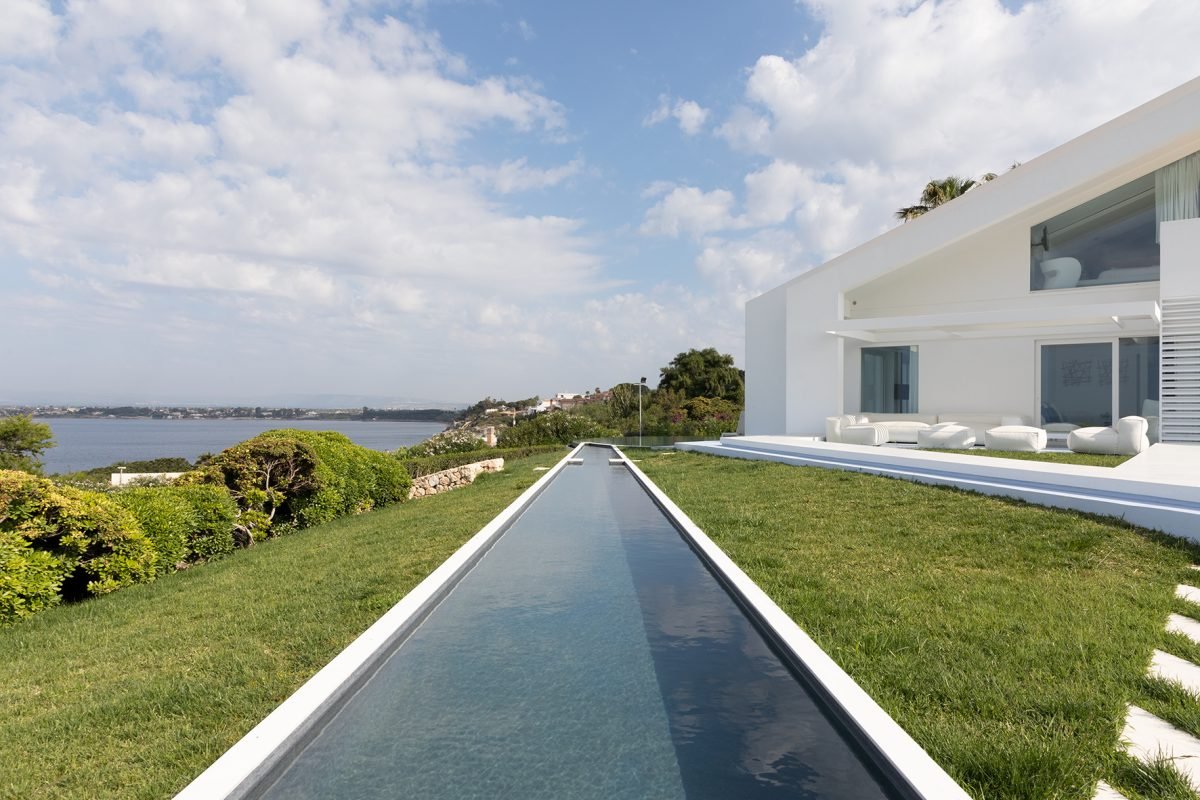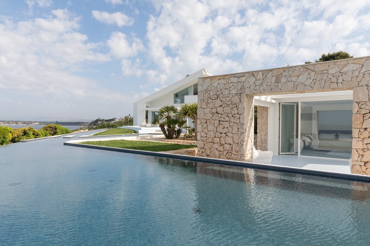 Villa 4 bedroom in Plemmirio SR is divided into two buildings, both surrounded and enclosed by the swimming pools. The main body of the house resides on two floors: the ground floor is on the same level as the terraces and consists of two ensuite bedrooms with views and direct access to the heated swimming pool, a living space with a fully-equipped kitchen, and an open space with a dining room area, living area, and television. The guest bathroom completes the floor.