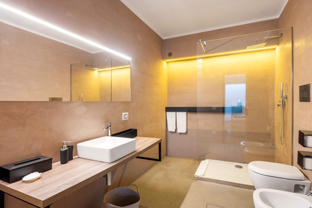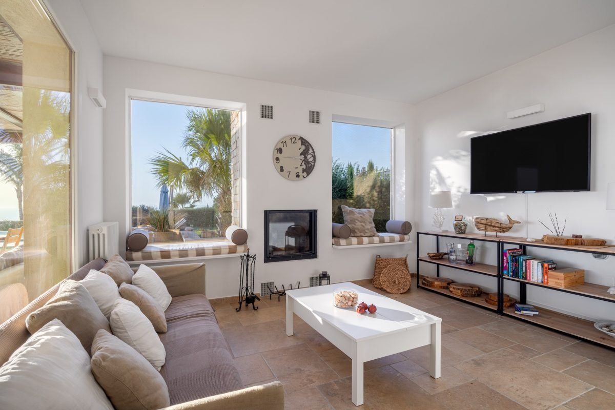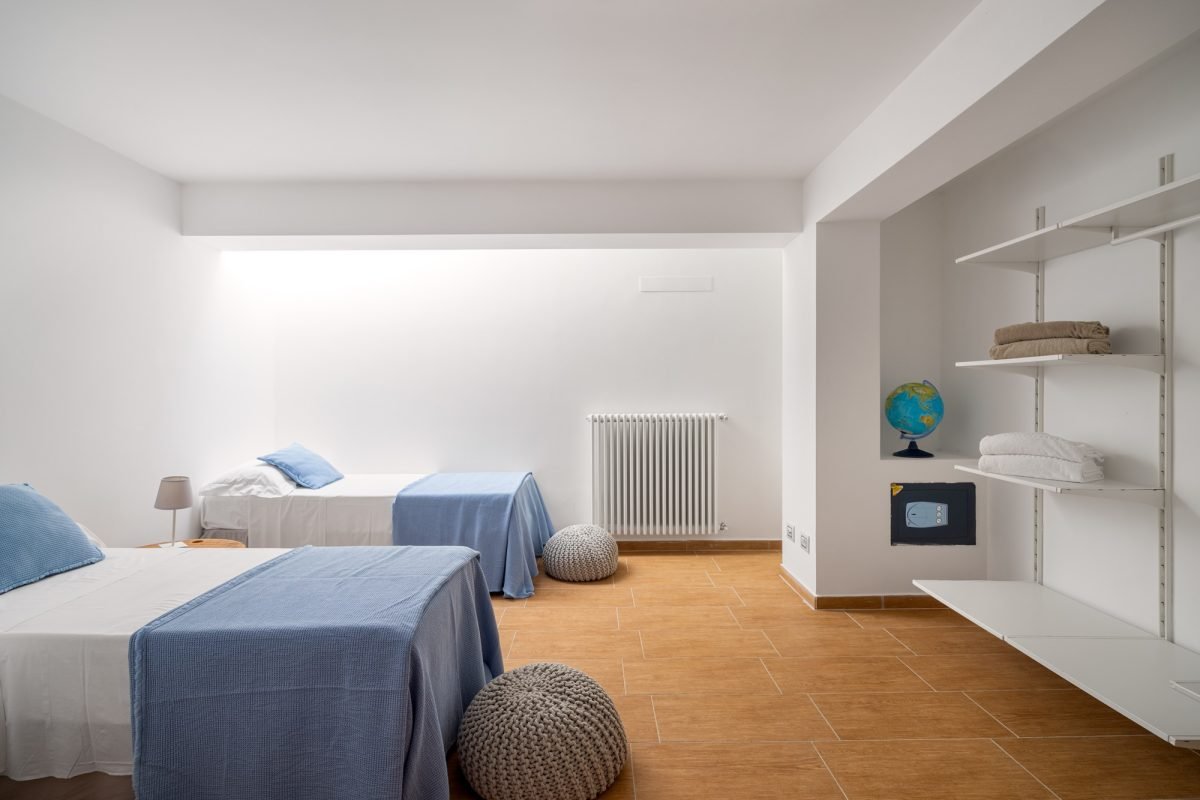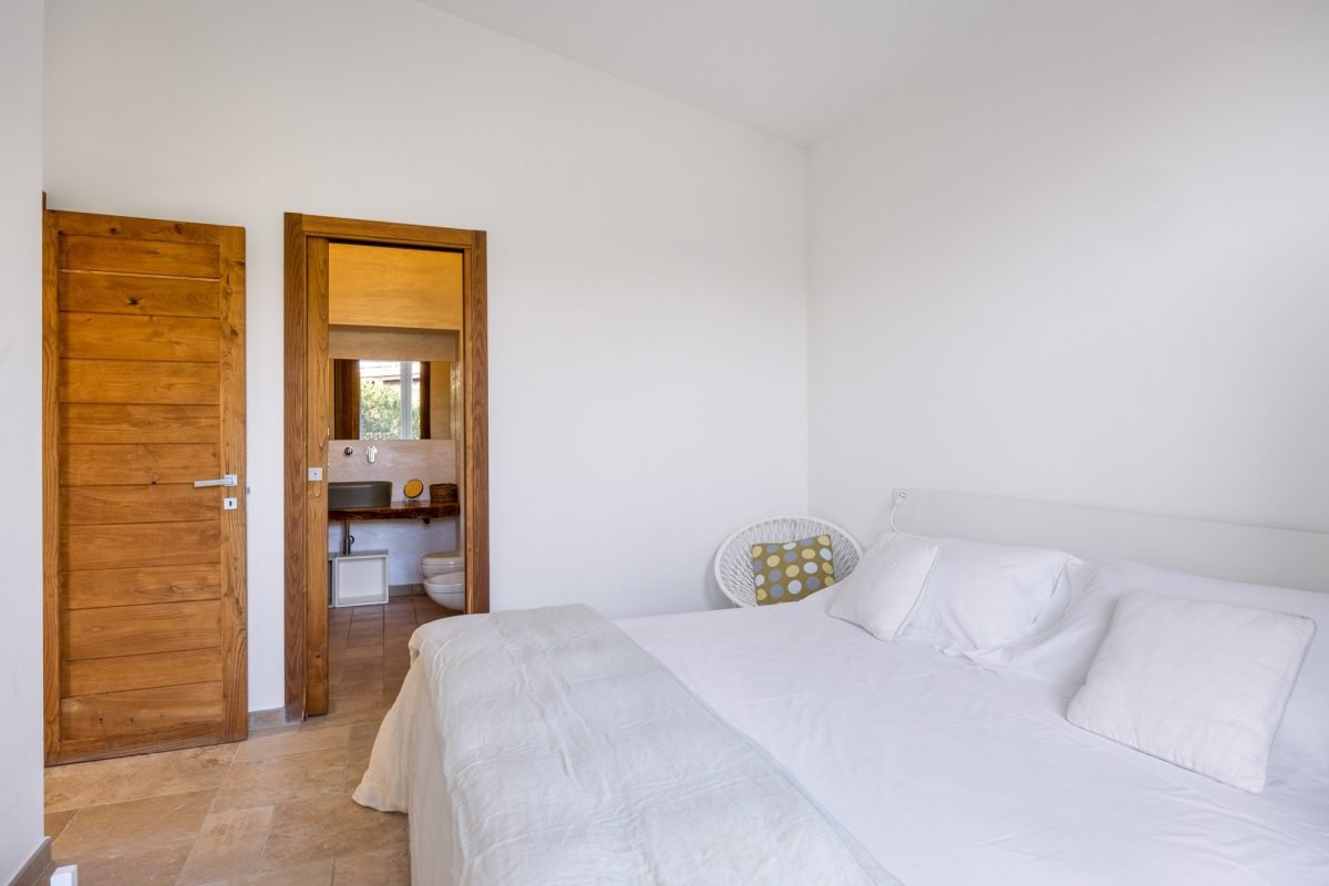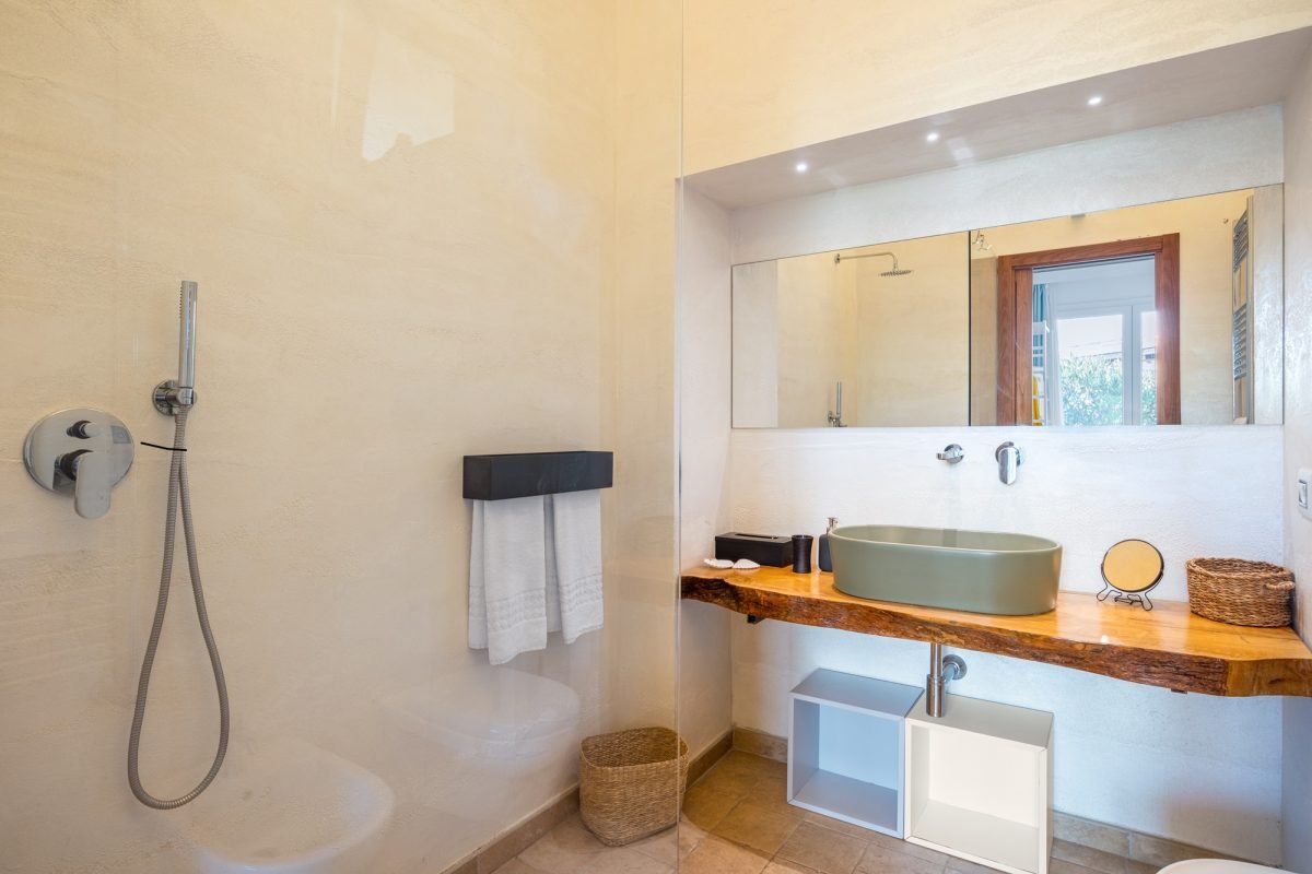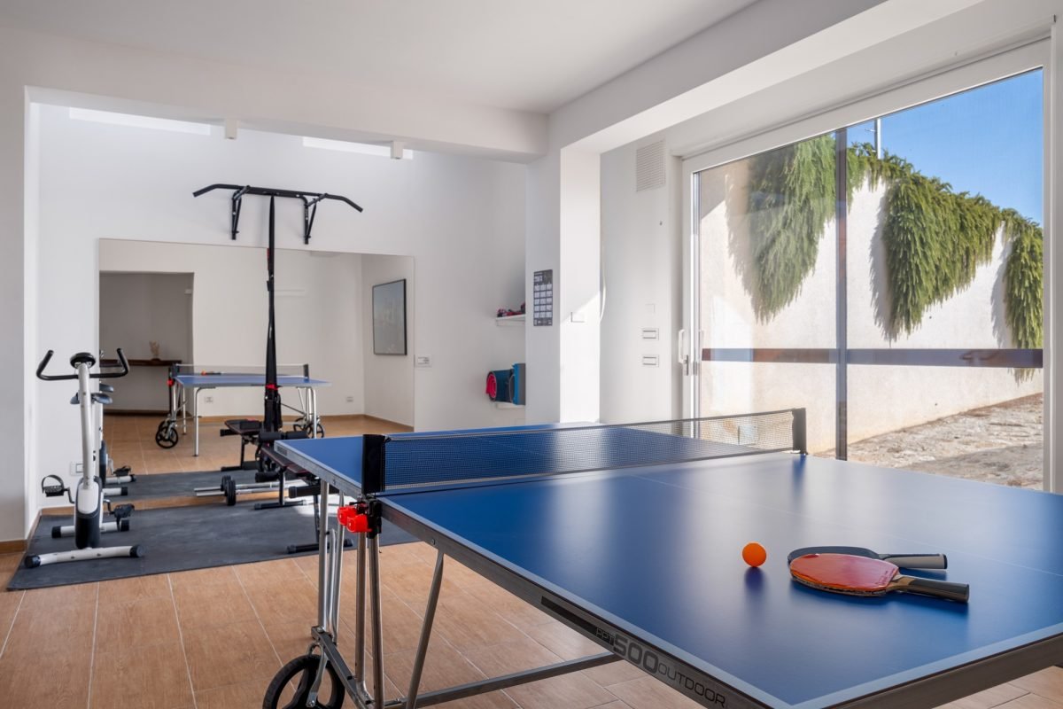 On the ground floor, you’ll find two more bedrooms: a master with private bathroom and a double with a bathroom nextdoor, all illuminated by the natural light which streams from the skylights, creating a comfortable and airy atmosphere without the need for air conditioning. Here, you’ll find a wellness space with a ping pong table, as well as a laundry room.