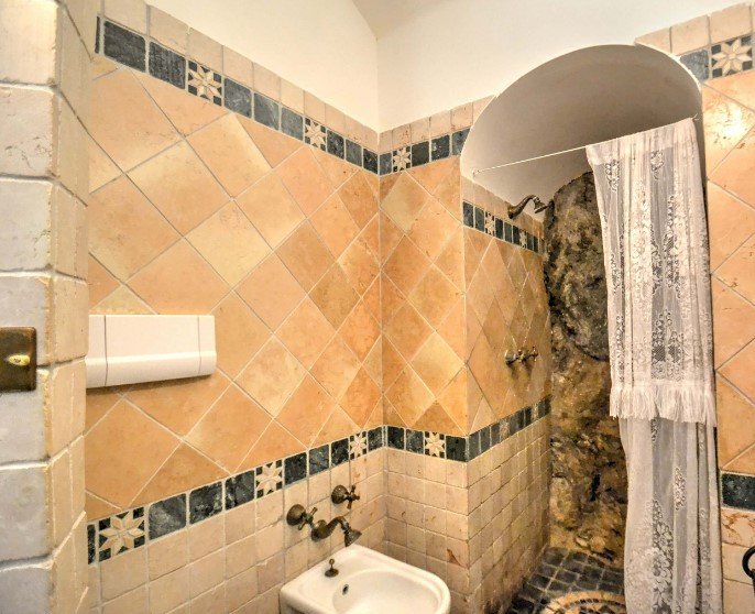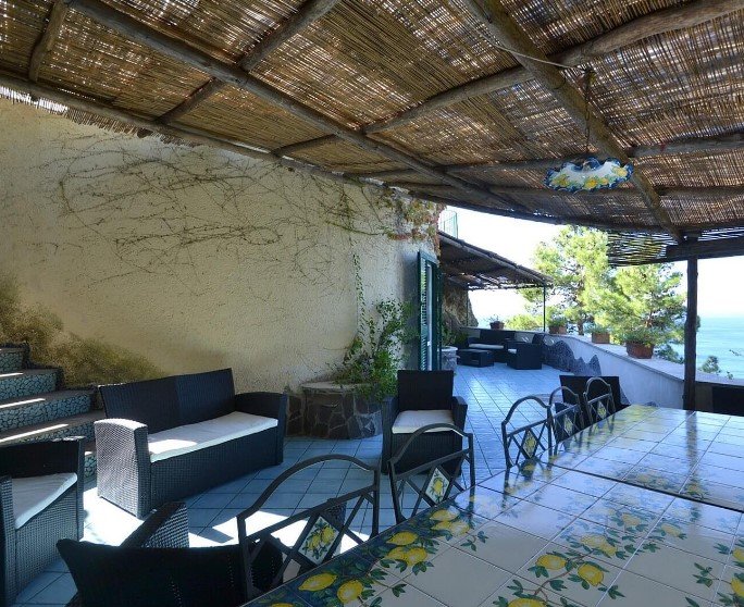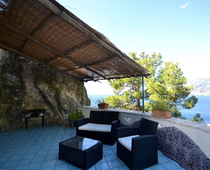 Now, there is a magnificent terrace at the top of the tower, linked to a smaller rounded terrace on top of a rocky ledge that juts out towards the sea. From up there you can see, in the distance, a stretch of the coast up to Amalfi and even as far as Capo di Conca dei Marini, which has a similar antique lookout tower. At closer range, you can see a promontory of white limestone covered in thick Mediterranean vegetation, with its steep cliffs overlooking the deep sea. Directly below you lies a little bay, where the shadows cast by the rocky sea bed cause the sea to change colour from deep blue to emerald green, and becoming white and transparent beside the shingled shore.